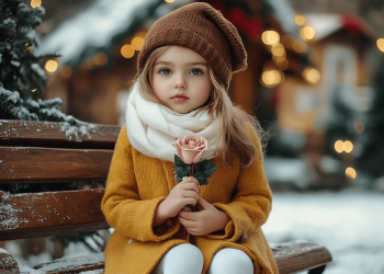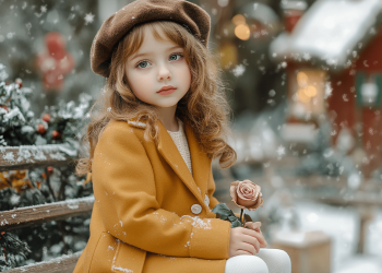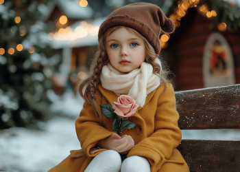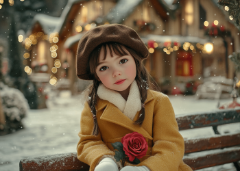 https://uploads.syntxai.com/1282367741583691936 винтажный цвет, гиперреалистичная фотография в стиле Гэри Кутюра, маленькая девочка в винтажном коричневом берете и желтом шерстяном пальто, в белых винтажных колготках, сидит на деревяной скамейке со спинкой, держит красную розу, лицо и глаза смотрят прямо в камеру, на фоне рождественского сказочного светящегося дома, объемный свет, немного боковой ракурс съемки —cref https://uploads.syntxai.com/1282349769850617957 —ar 3:2 —c 100