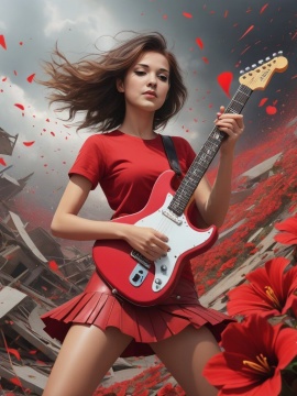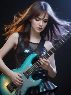 guitarist, art nouveau, realism postcard, day and night, diptych, cold and hot, mannerism, cinematic, dreamy, romantic, close macro portrait, fairytale, hyperrealistic, hyperbolized, gothic surrealism, close up gracious black-haired girl, smoky eyes, electric guitar, sunset, black t-shirt, jeans, tattoos, thorns, dark and ethereal element, moonlight, dynamic pose, tiny sparks, intricated lighting, windy, looking at camera, detailed landscape, by mucha, kuindzhi, ray caesar, expressive eyes, detailed face, light on face, shadow play, epic dynamic poster, hyperrealistic skin texture, otherworldly glowing eyes, smoke, detailed textures, cute, adorable, vintage, art on a cracked paper, fairytale, patchwork, storybook detailed illustration, cinematic, ultra highly detailed, tiny details, beautiful details, mystical, luminism, vibrant colors, complex background